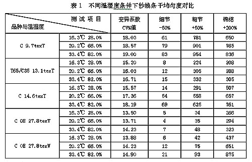 就一般測試條件而言,造成這種變化的原因可能還有其它方面的因素,如紗線不同片段間的離散性,由于被測紗線不能重復測試,各溫濕度條件下試驗的紗線片段間可能有差異,但不同片斷間本身的條干均勻度差異不會形成如此顯著的變化;另一方面是由不同測試人員在不同的儀器上測試,如今的條干均勻度測試儀和測試操作,經過多年的不斷發展和完善,儀器狀態已趨于穩定,操作已基本趨于規范。故以上兩因素造成條干均勻度測試明顯誤差的可能基本排除,因此而言,溫濕度是造成條干均勻度測試結果明顯差異的主要因素。